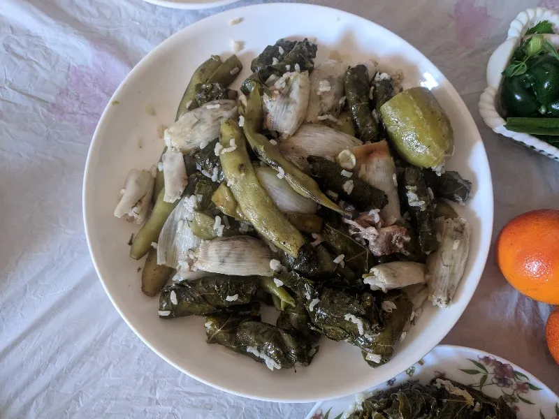 From the outside you can see cucumber, onion and vine leaves. Inside they are stuffed with meat, rice, onions, garlic, mint, cabbage and anything else compatible. This can be served hot or cold, and with yoghurt.