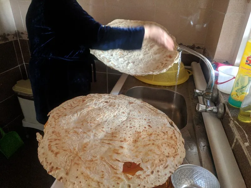 The flat soft bread was definitely something unique to the Kurdish cuisine. You buy it dried. Massive disc the size of our bike wheels can be purchased in a big stack. They last for a year approximately, and only take 5 minutes to prepare.