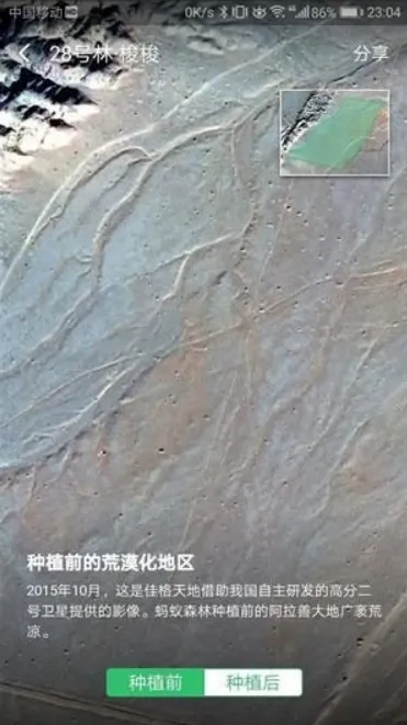 Each users' account has its carbon emission reduction recorded on the Alipay app. Each Saxaul amounts to 17.9kg of carbon capture. If each of the 100 million trees were the smallest option, the saxaul (and I'm sure many are the larger species), that amounts to 1,973,137 tons of carbon capture that Ant Financial can now sell off to other companies. Each ton can get you about $7, which doesn't sound like much until you do the maths - almost $14,000,000 in total so far.