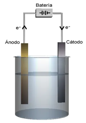 Es el proceso mediante el cual se utiliza la corriente eléctrica para forzar que se produzcan reacciones químicas de oxido-reducción (redox) no espontaneas. El sistema reaccionante está constituido por una celda y la corriente entra y sale desde los electrodos, a este tipo de celda se le conoce como celda electrolítica, otro tipo de celda son las denominadas celdas voltaicas o galvánicas, en las cales una reacción espontanea produce energía eléctrica capaz de suministrarse a un circuito eléctrico.