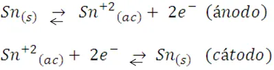Los iones estaño no pasan a la solución de forma espontanea (es decir, este metal no se disuelve al colocarse en la solución), pero al suministrarse energía eléctrica al sistema la reacción se produce. Los electrones son formados en el ánodo (donde se produce la oxidación) y se consumen en el cátodo; y así, la fuente de corriente continua obliga a los electrones a moverse del electrodo positivo al negativo, por lo tanto, en todas las celdas electrolíticas el ánodo es el electrodo positivo y el cátodo el negativo.
