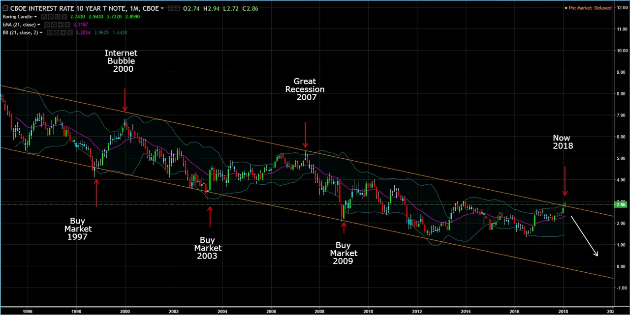 The bond market is almost 2X the stock market. The 10 Year Bond is the highest traded bond by volume. If you just followed the yield of the 10 year bond over the past 15+ years, you could have timed the stock market with 100% accuracy. Below is a monthly chart of the TNX that tracks the yield of the CBOE Interest rate 10 year bond.