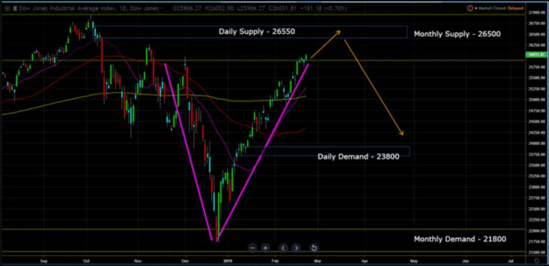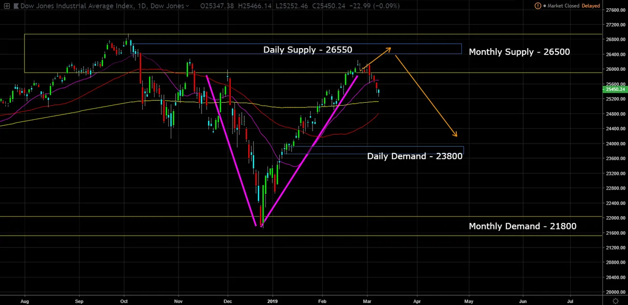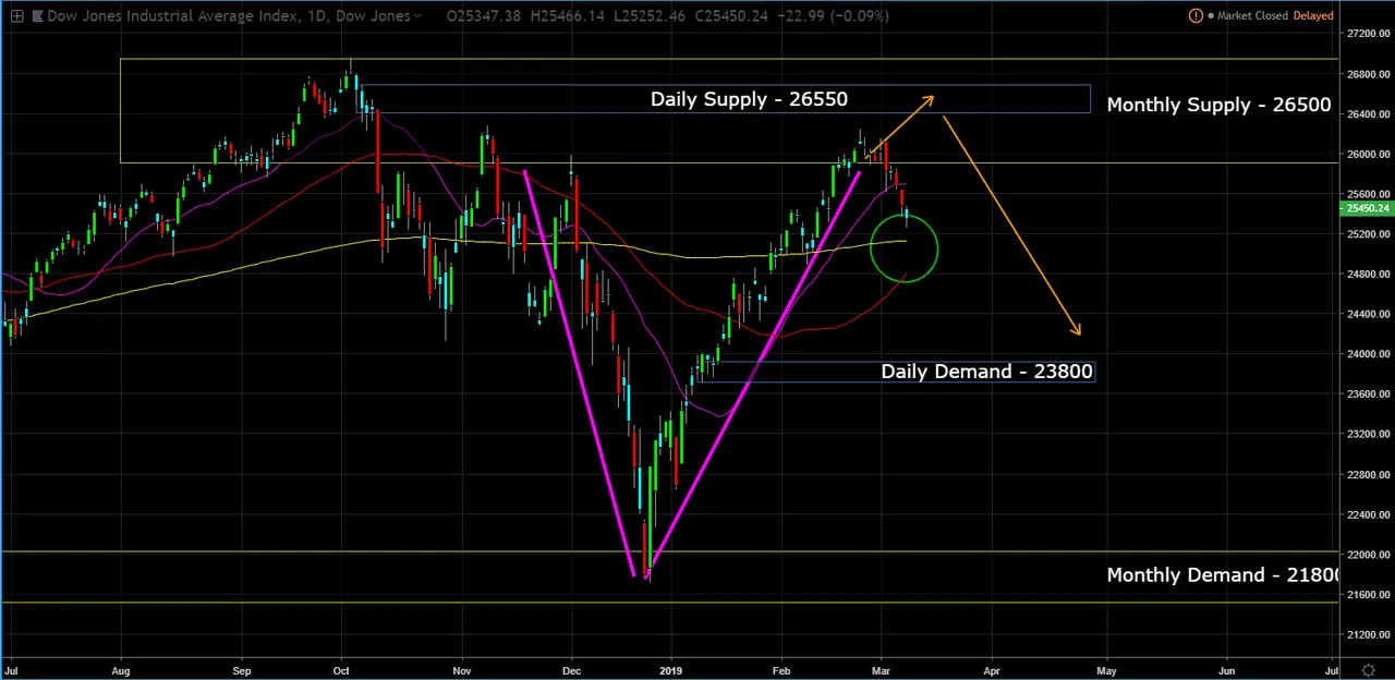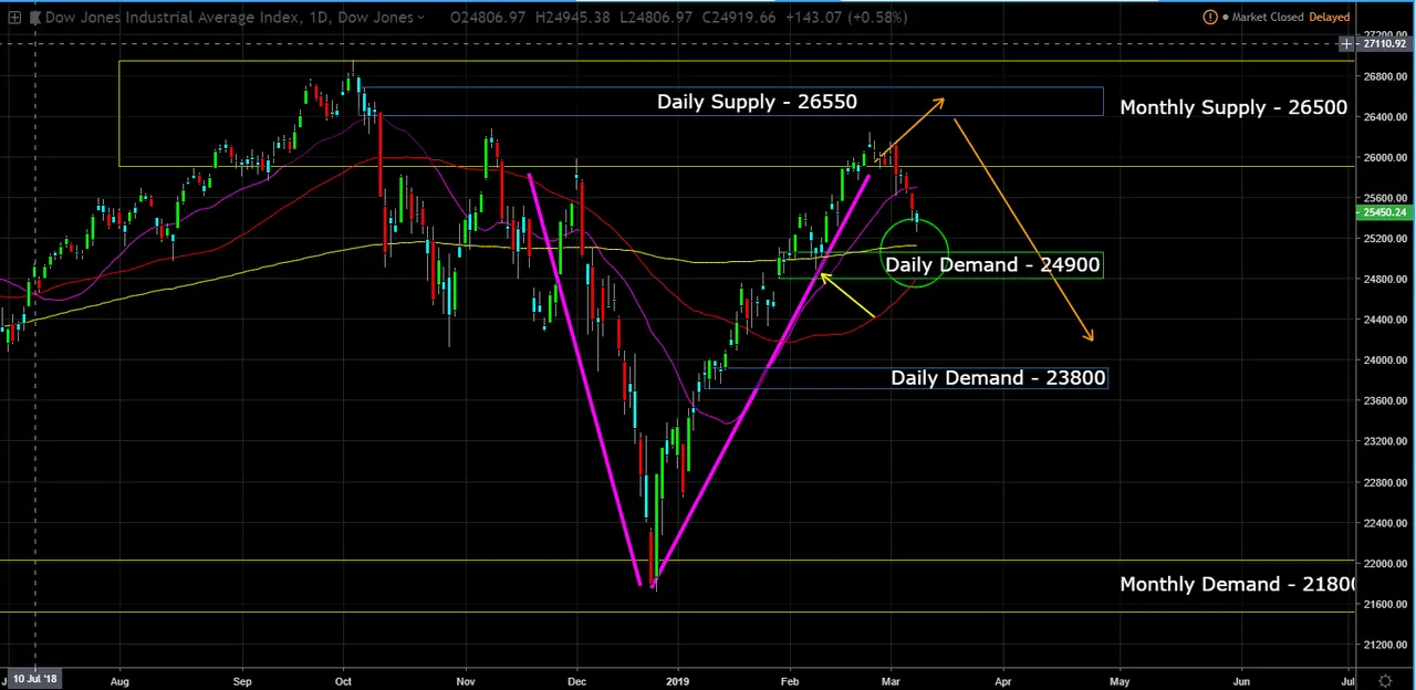Thus, the DOW didn't hit the daily supply, but has pull back within the monthly supply zone.