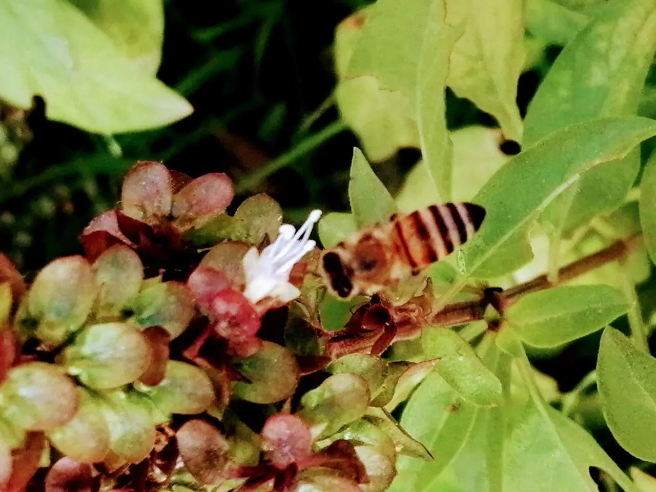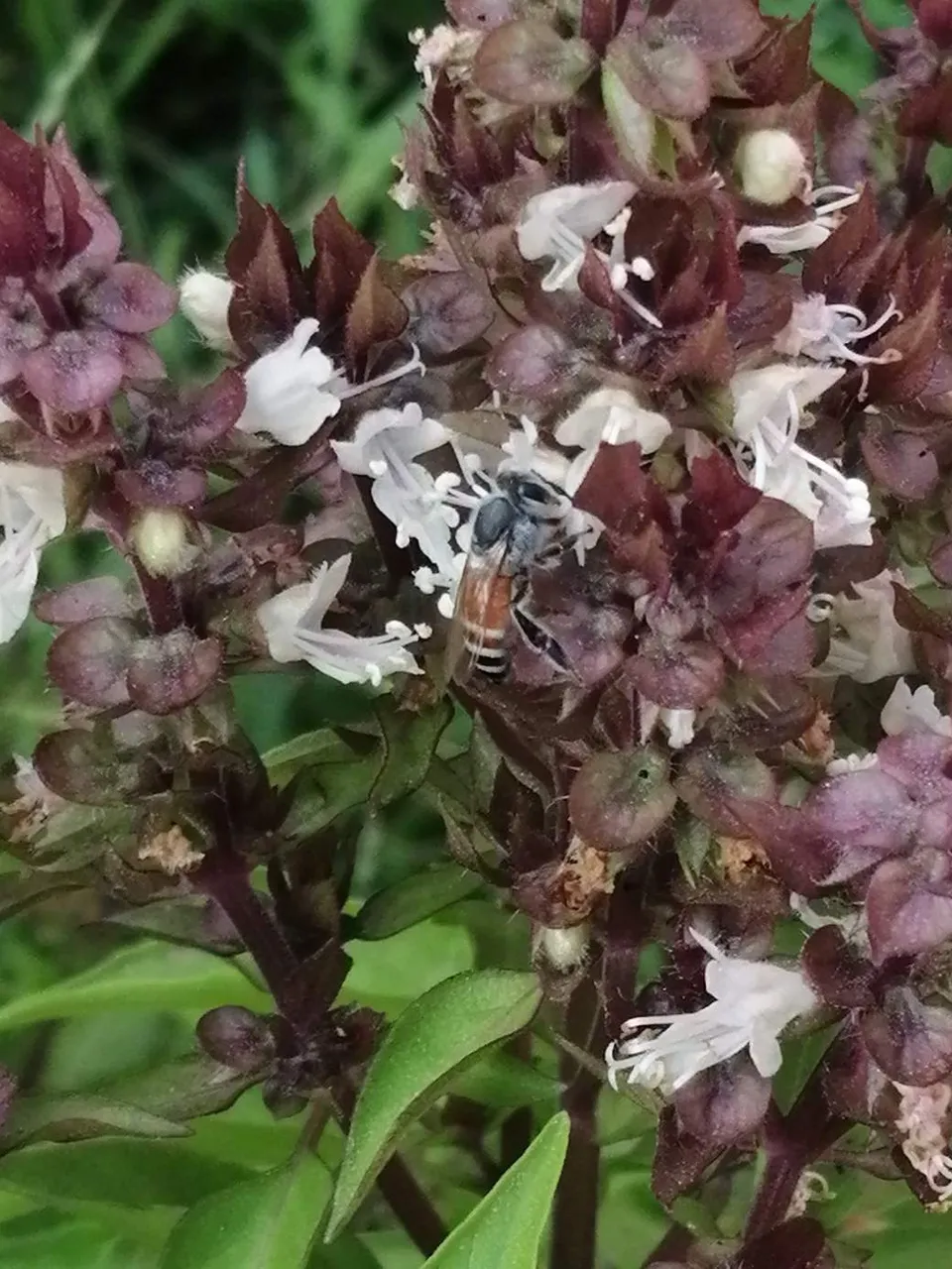 There are so many spiders and insects flying away. The bees are sipping the nectar of basil flower.