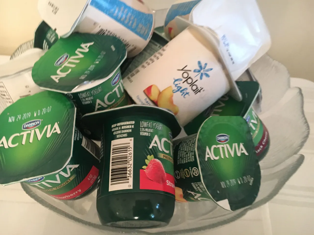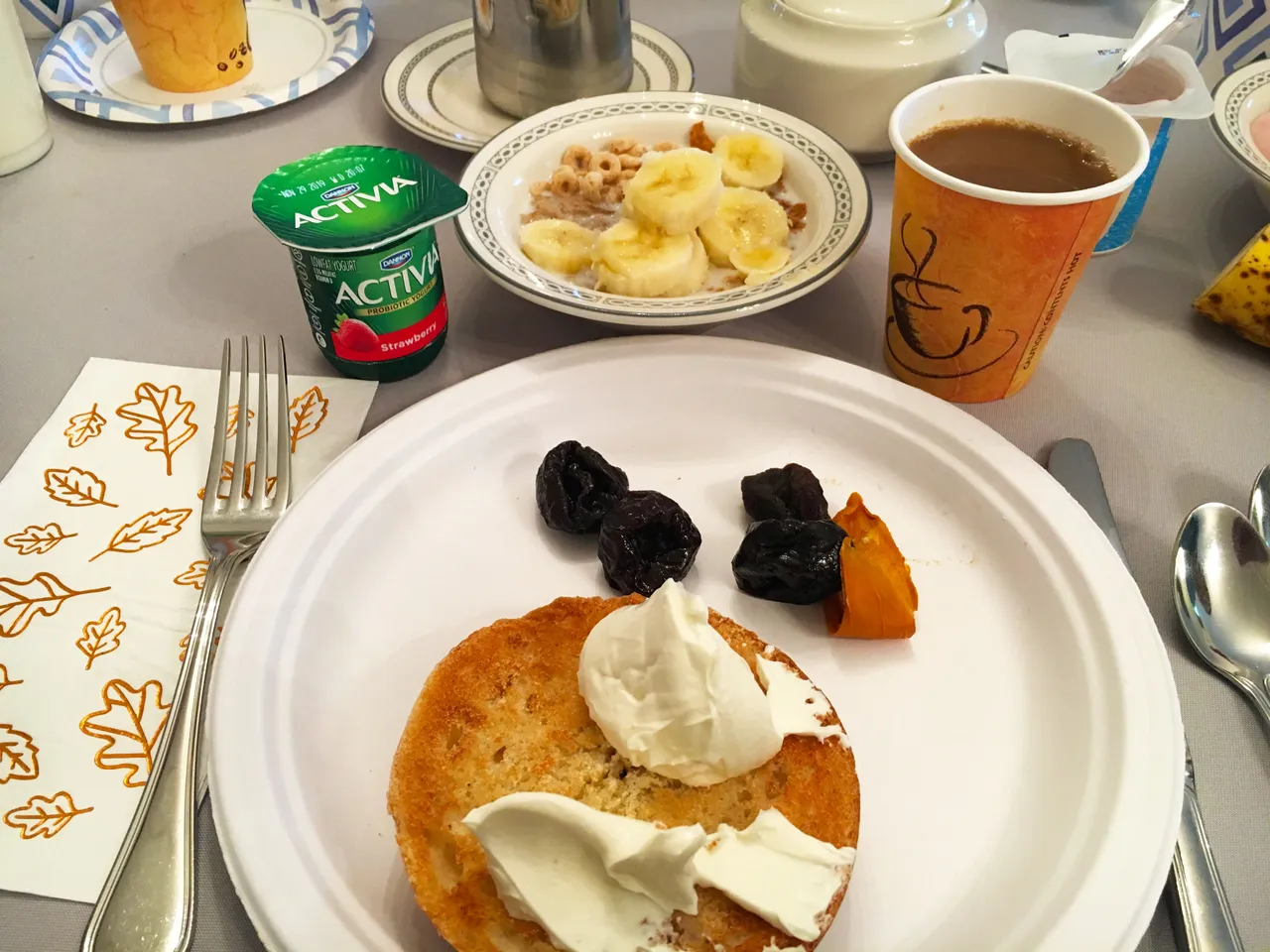 Bagel with Cream Crease, Dried Prunes & Mango slices, Cereals with sliced Bananas and Milk, and Yogurt, Coffe with cream & sugar.