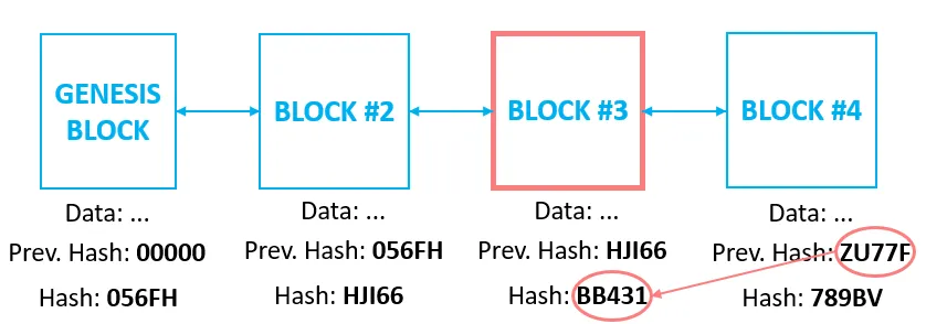 Cuando el hacker modifica la información del bloque el hash es regenerado (ya que es único) y cuando el bloque siguiente apunta al bloque hackeado se da cuenta que el hash es diferente al que el tiene que apuntar y se produce un error, por lo que el hacker tendría que modificar los bloques siguientes también.