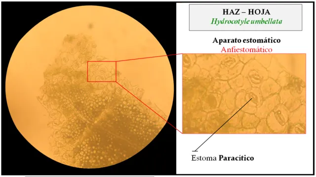 Figura 2. Del lado derecho, se observan Estomas paracíticos Hydrocotyle umbellata, en el lado izquierdo se indica, la forma del aparato estomático Anfiestomático. Autor: @lupafilotaxia.