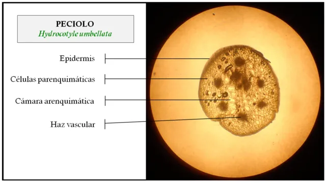 En la sección transversal, del peciolo de Hydrocotyle umbellata, se observaron células epidérmicas poligonales, seguido de tejido cortical parenquimático de morfología circular, con visibles espacios intercelulares arenquimáticos, y haces vasculares colaterales, distribuidos irregularmente alrededor de la médula.