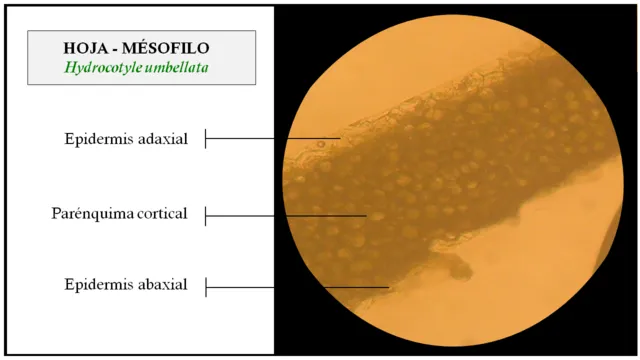 El mesófilo de la hoja de Hydrocotyle umbellata, exhibe una simetría dorsiventral, células parenquimáticas de forma circular, apreciablemente poligonales, con espacios celulares, seguido de células colenquimáticas irregulares, y con haz vascular de tipo colateral.