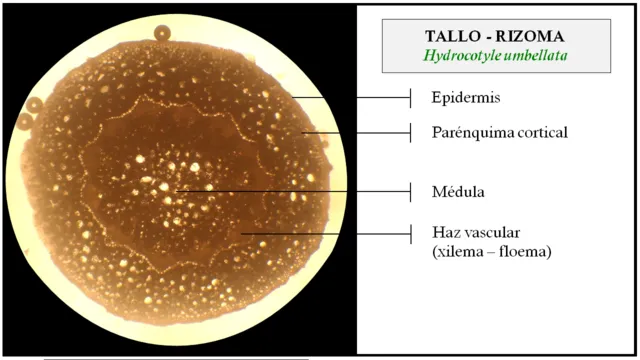 El tallo rizomático de Hydrocotyle umbellata, se encuentra constituido histológicamente por, células epidérmicas delgadas y lisas, parénquima cortical de morfología poligonal, células xilemáticas y floemáticas, dispuestas en haces vasculares colaterales, sobre el círculo medular, con protoxilema hacia el lado externo y el metaxilema hacia el centro de la sección.