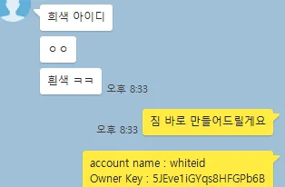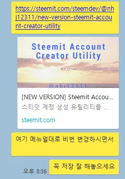 오늘 저녁 원하는 아이디를 물어 바로 만들어주었다. 내가 어제 공개한 스티밋 계정 생성 유틸리티를 통해서 말이다. 만드는데 정말 1분도 안걸렸다.