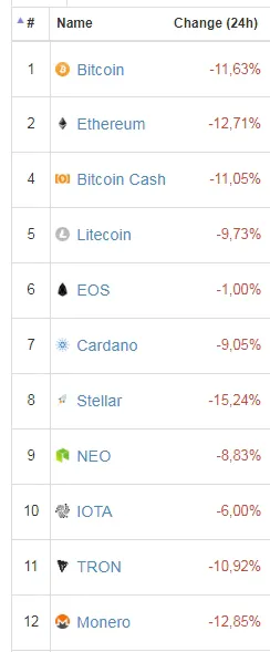 Bitcoin %50 , Ethereum %46, Bitcoin Cash %70, Litecoin %50, Cardano %70, Stellar %40, Iota %70, Dash %70, Monero %50 ve Nem %77 oranında düşüş yaşadı.