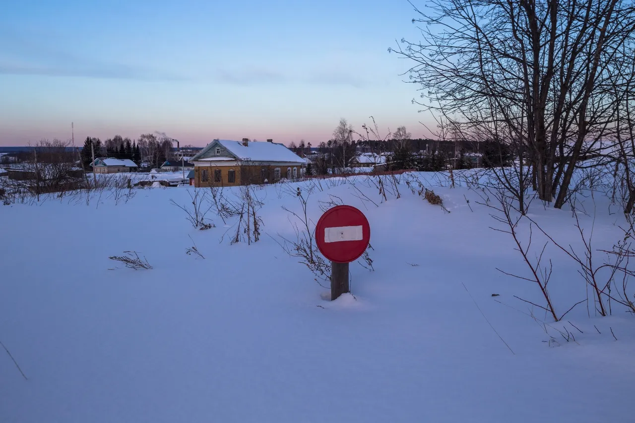 A homemade road sign "brick" looks out from under the snow. Probably in the summer there are many who want to drive through someone's territory.