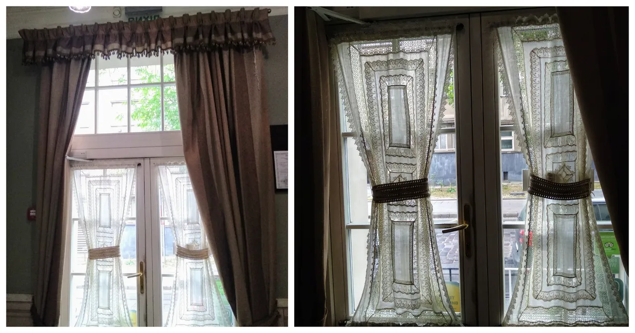 All clients are quietly communicating or focused. Closing the door, I noticed the bright signs of Provence, the doors on the inside were curtained with cream curtains with laces with a special ribbon.