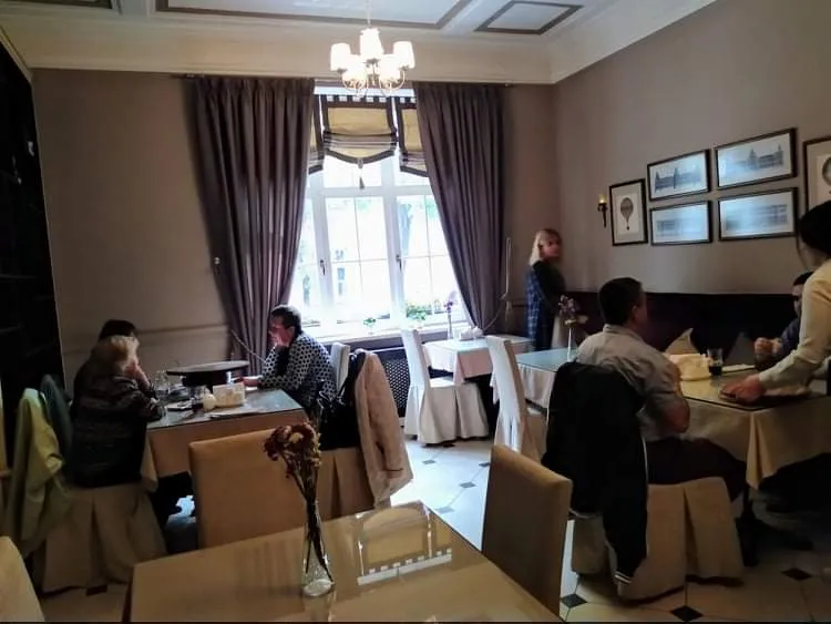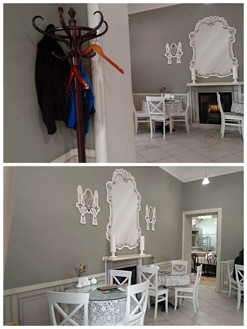 Next we look at the place of tables for clients. In this hall they are located on the right side. As for me, this is one of the most vip places in this cafe. Three tables are under the large window in the style of Provence. As you can see in the photo, there is an arch window with wood inserts and everything is painted in white paint.