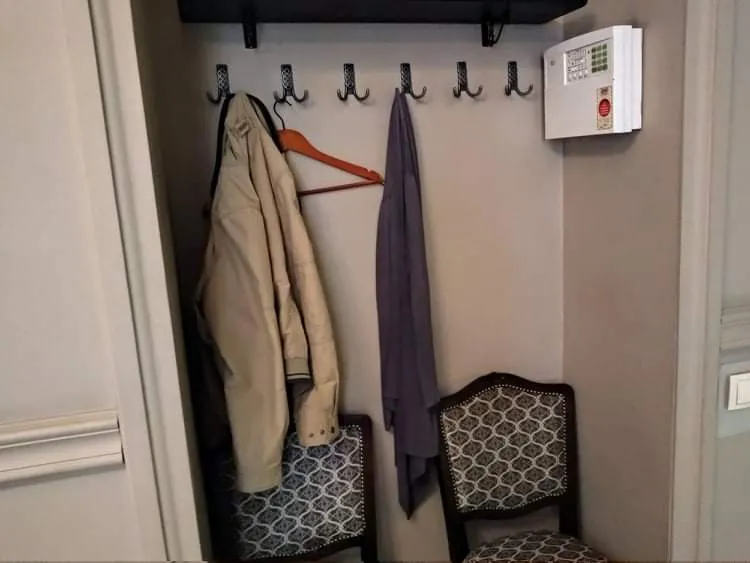 By the way, the chairs here are covered with fabric, hese are often served at weddings. There are minimal hangers at the entrance to hang clothes.