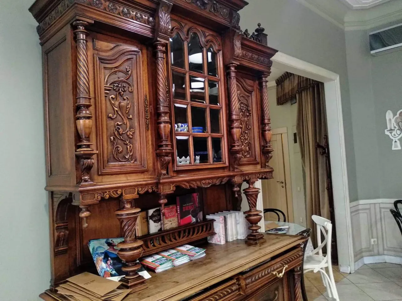 Walking past the first hall, you enter the next room. On the left you can see a very unusual element of the decor with a carved pattern sideboard