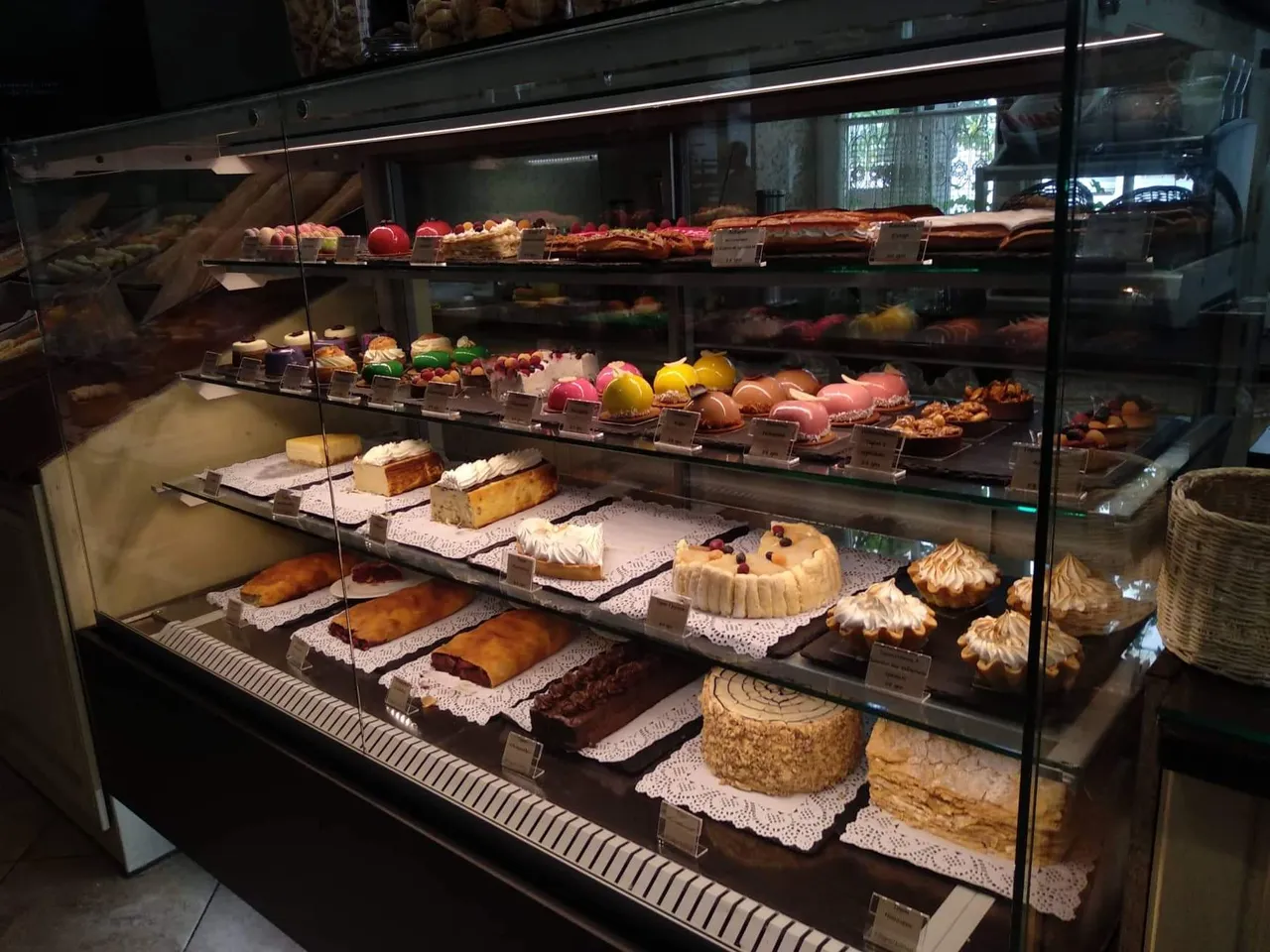 a true exhibit of times past. Right in front of it is a display case with very sophisticated desserts.