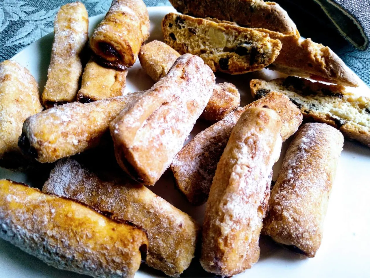 a crunchy cookie with nuts, and some cookies in the form of sticks with jam.