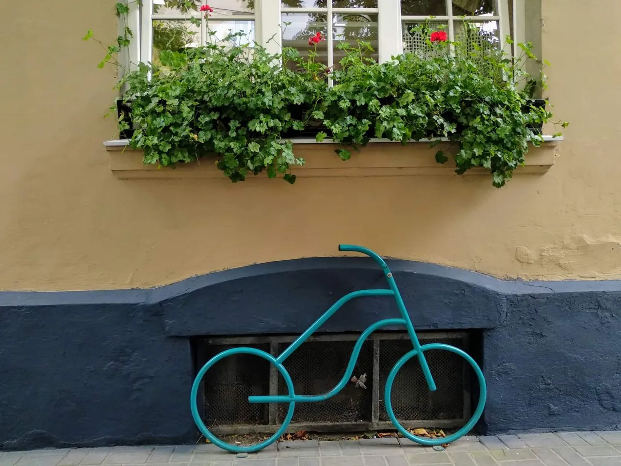 Beneath their windows were French elements like turquoise metal statues of bicycles.