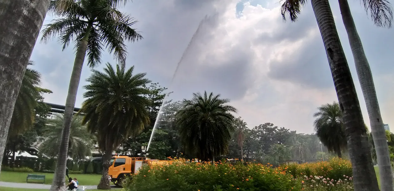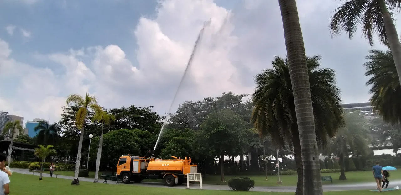 This water cannon truck made me laugh i don't know what his purpose was those black clouds were going to burst at there seam at any moment yet this water cannon truck was just spraying water into the air the only purpose it served was sending people scattering...lol.