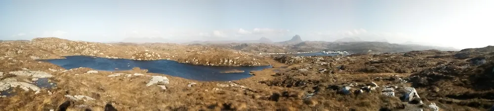 Left to right: The Quinag, Canisp, Suilven, Cul Mor, Cul Beag, Stac Pollaidh, arrayed on a landscape that looks a bit like the surface of Mars! Click here for a higher resolution image.