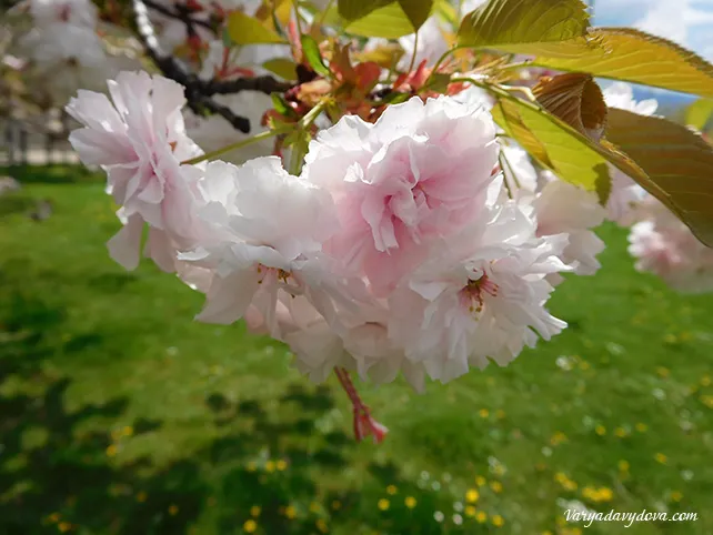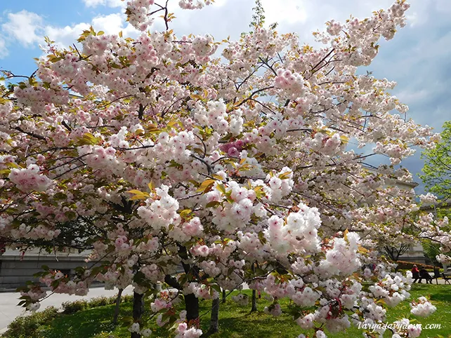 The flowers on these trees are pink and white, but I saw a red sakura in Sofia and even with green flowers. True true!