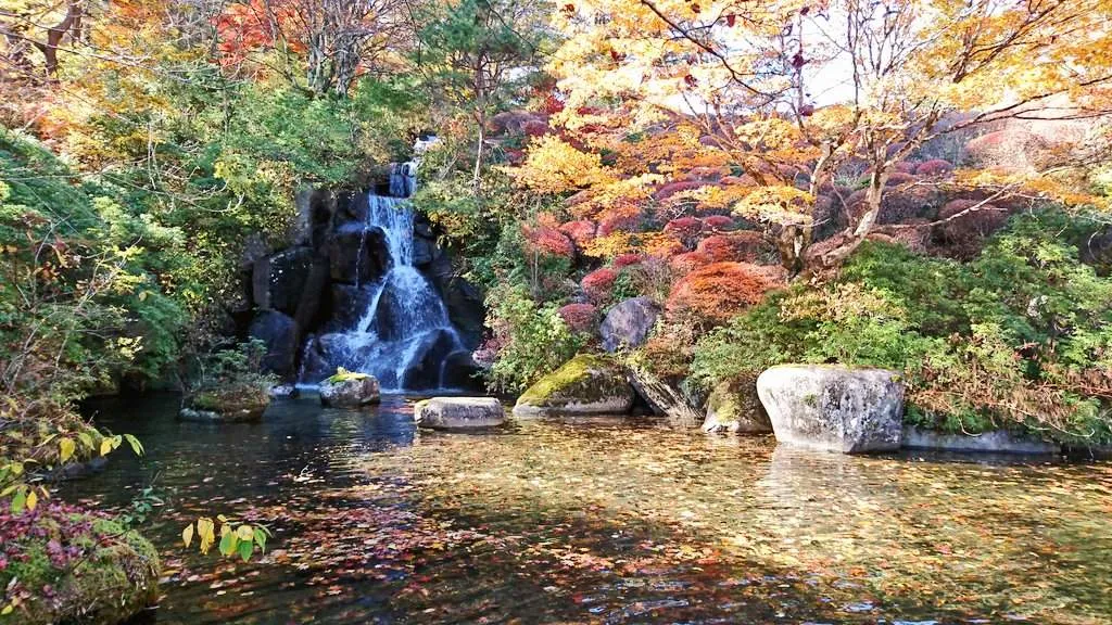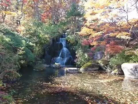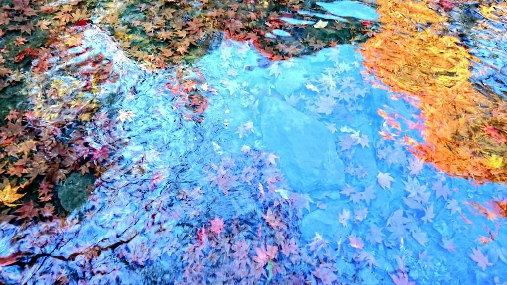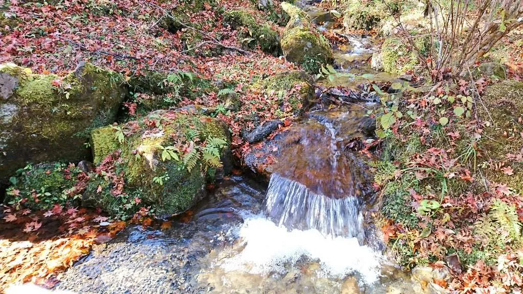 A beautiful place with a small waterfall and autumn leaves↓