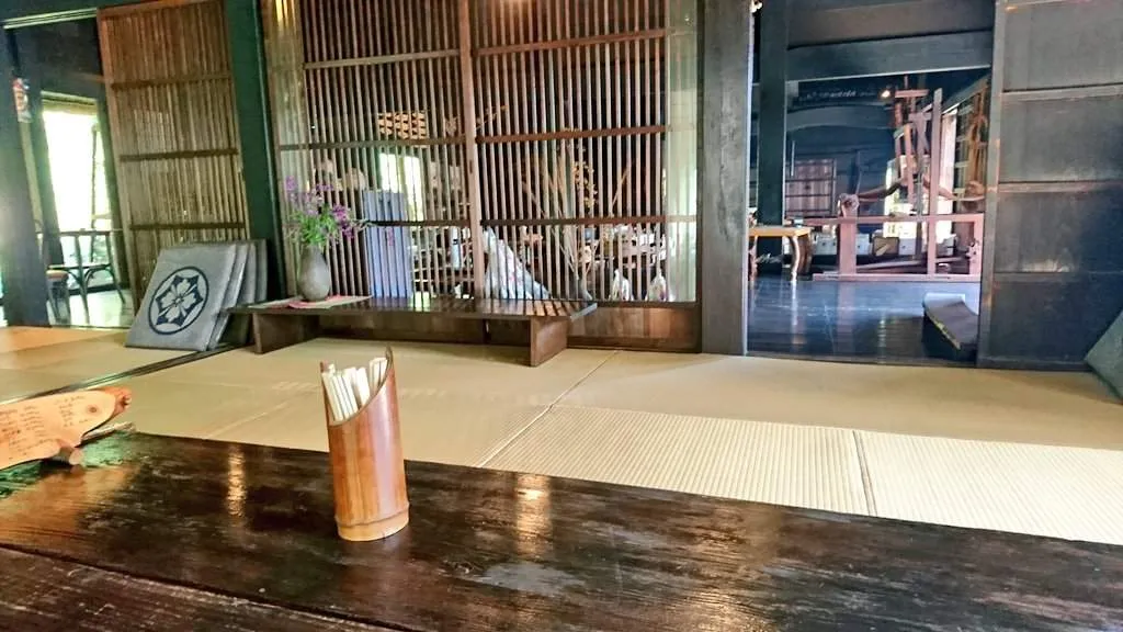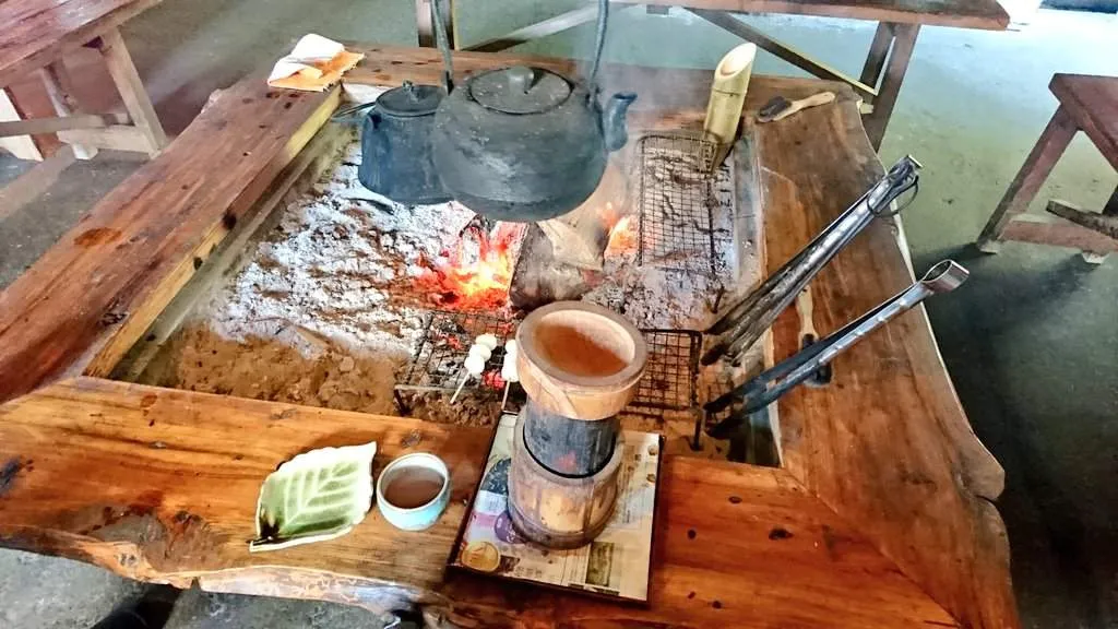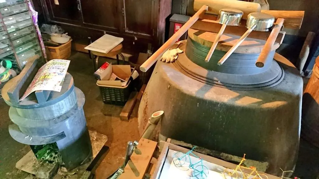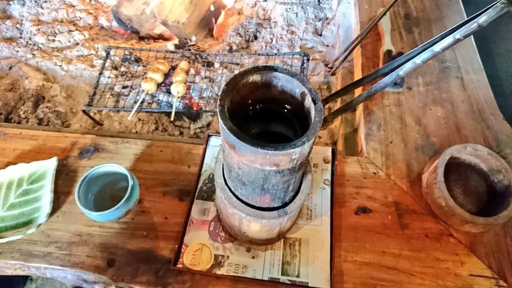 This bamboo container contains soy sauce, I ate "dango(Three rice flour balls, left on net in pictures" with soy sauce↓