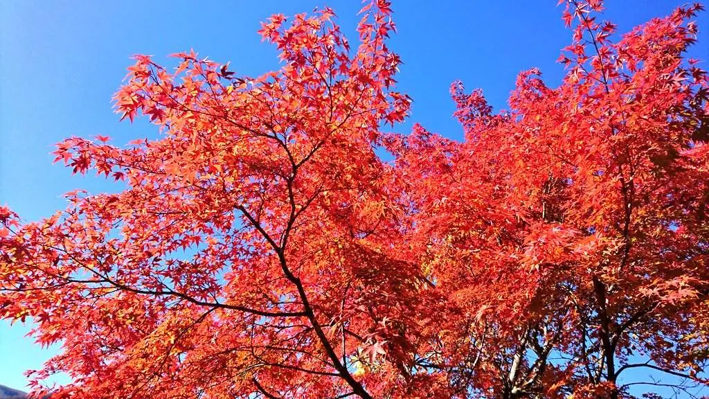 The sky and autumn leaves are beautiful! There are no clouds in the sky