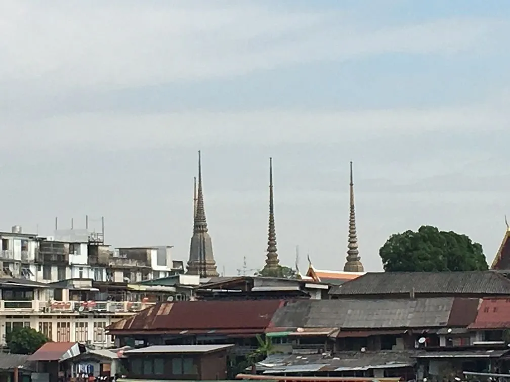 - 자전거를 안전한 곳에 세우고 강가에서 딱씬왕 동상 옆에서 강건너를 봅니다. 가늘고 높은 탑 3기가 보입니다. 왓포입니다.