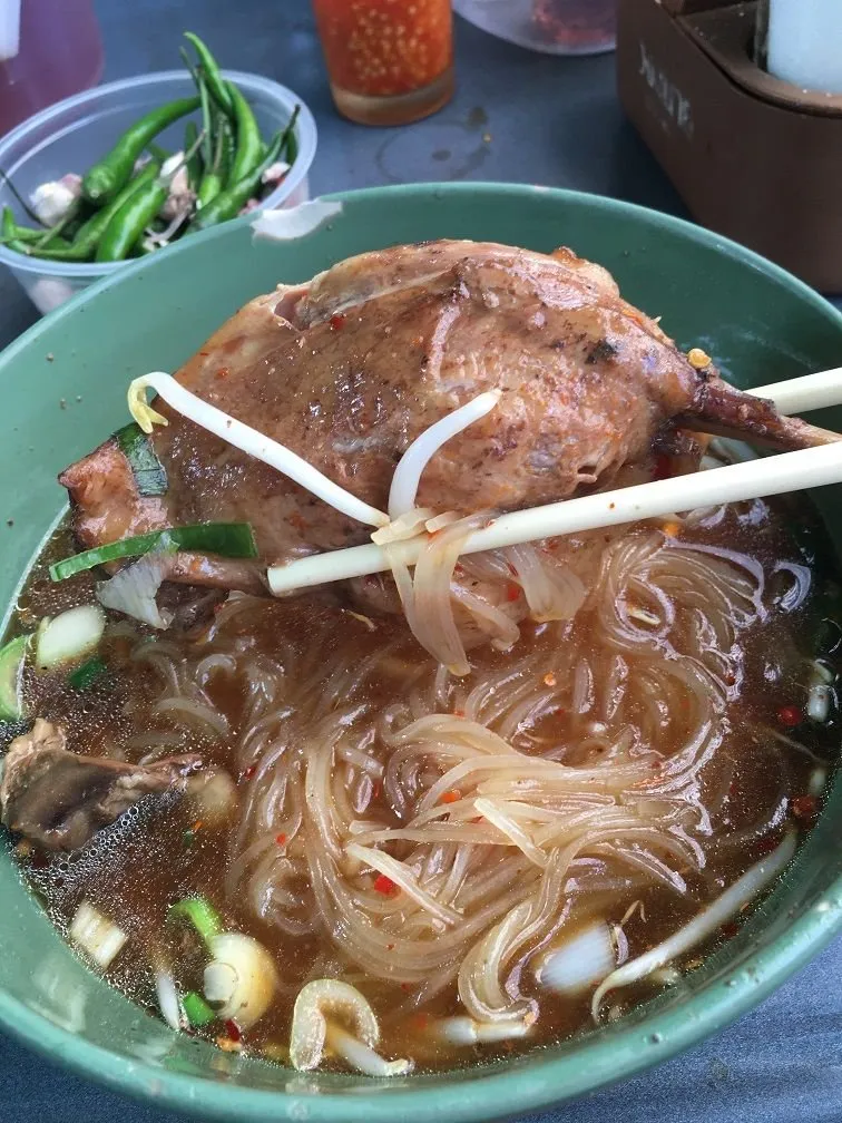 - 국수와 오리다리가 하나 똻! 짬뽕그릇 보다 1.5배 큰 용기에 담아줍니다. 아주 맛나게 먹습니다. 오리고기가 기가 막히게 잘 익었습니다. 부드럽게 넘어갑니다. 강추! 양도 많고 오리고기에 한그릇에 80밧입니다. 저녁 굶어야 하겠습니다.