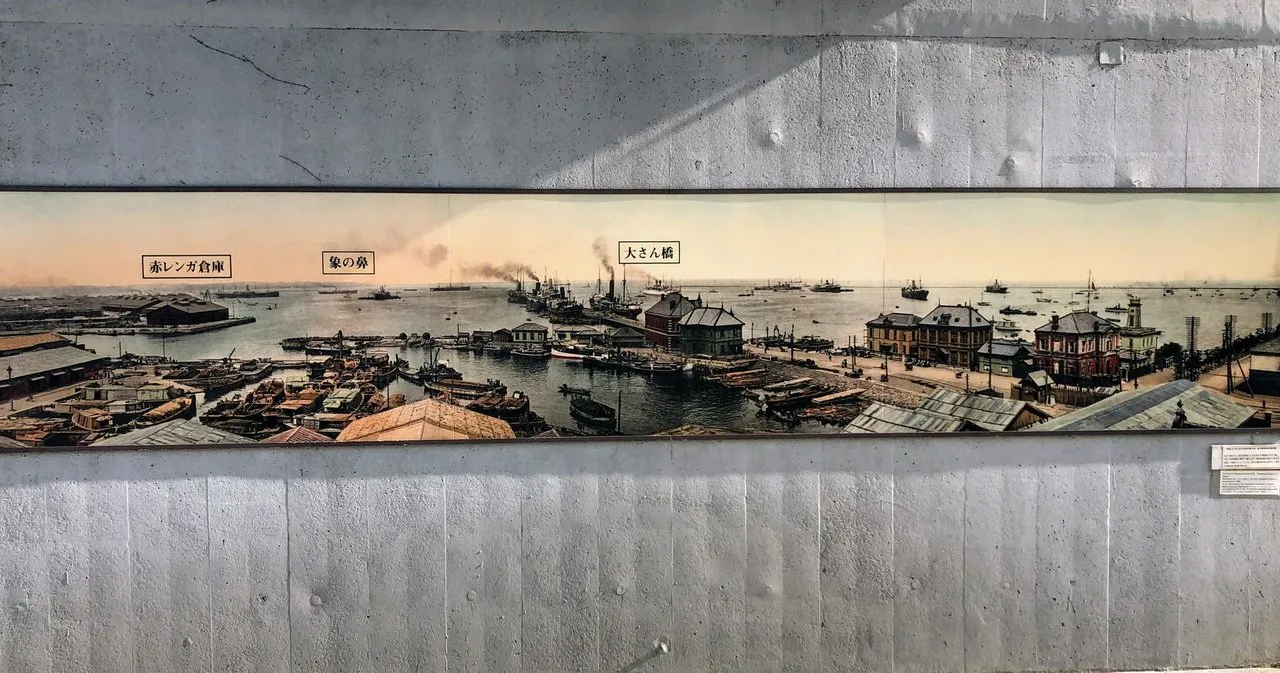오산바시의 옛날 모습 벽화가 길 한가운데 결려있네요. 아카렌가 창고도 보이고 가운데 코끼리 코라고 써 있는데 뭘가요?