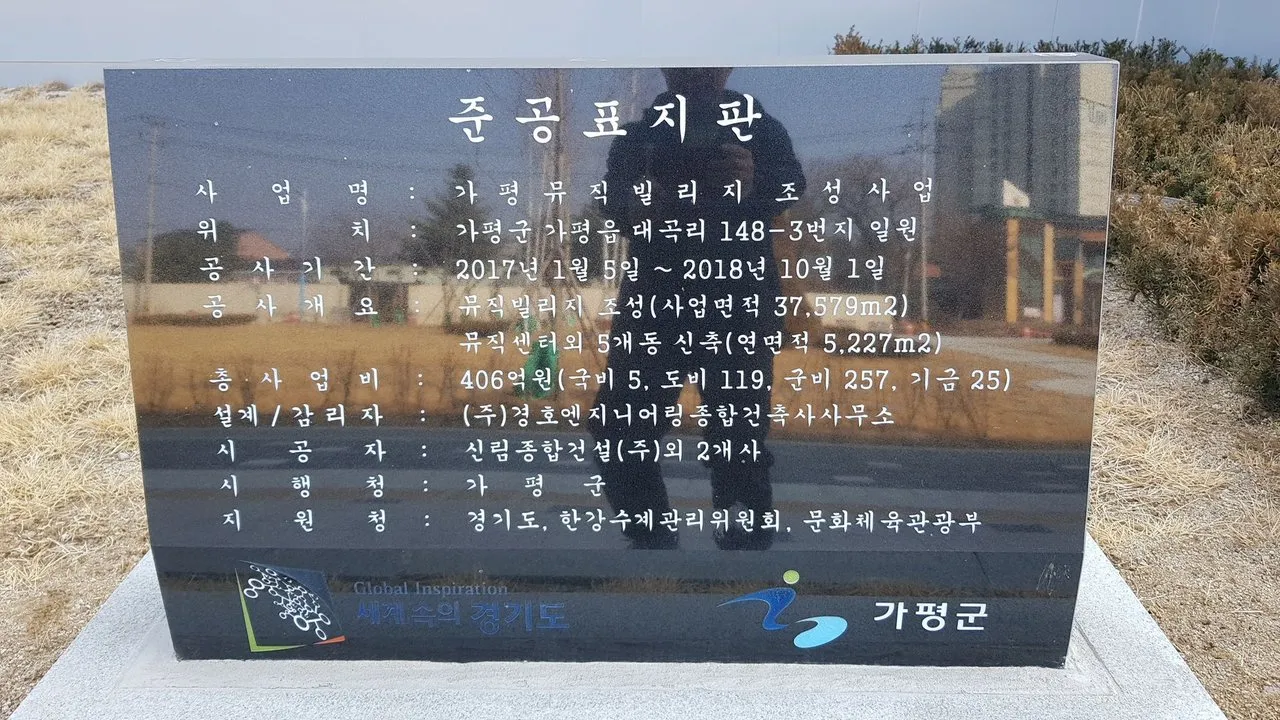 가평뮤빅빌리지 조성사업 준공표지판이 보입니다.