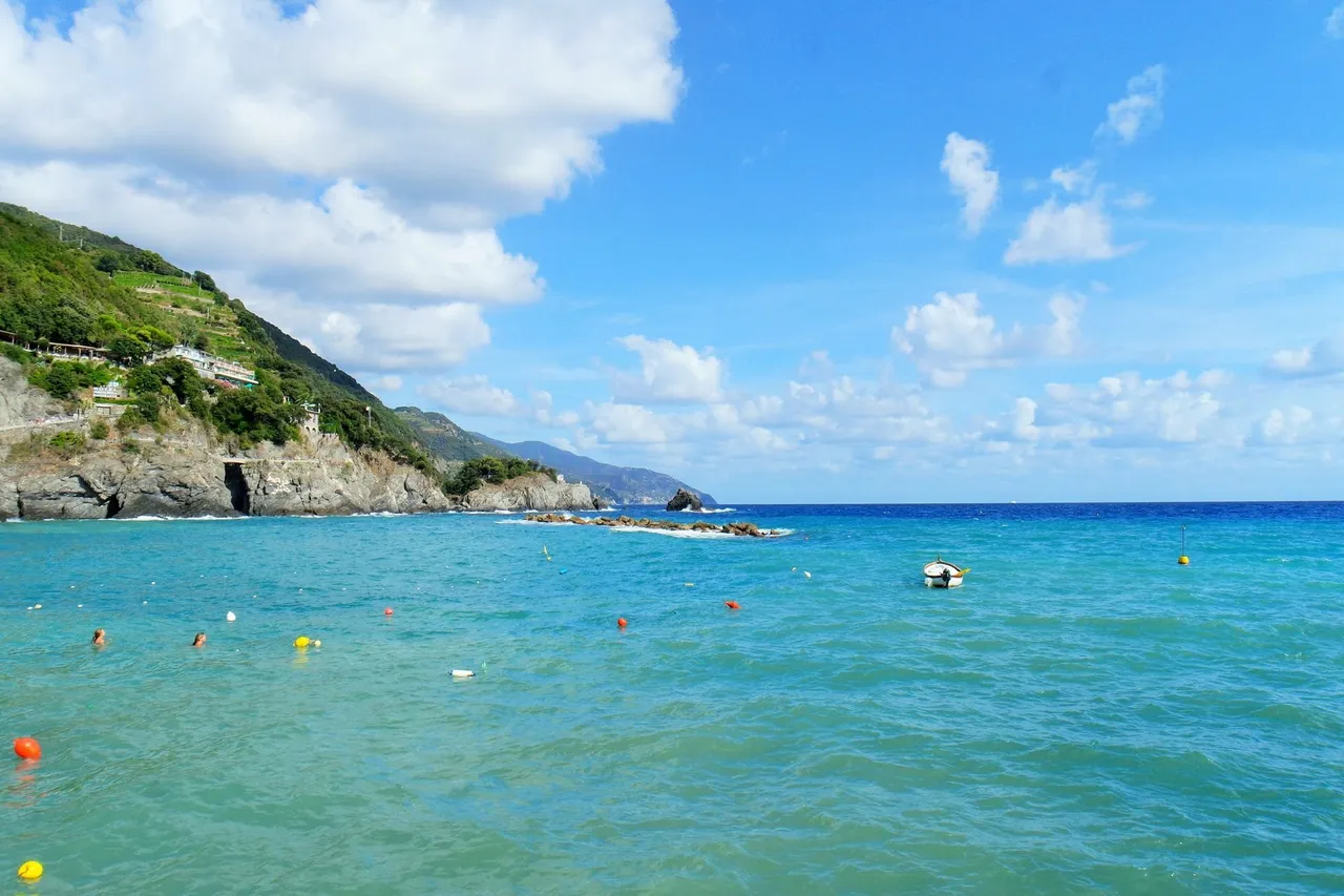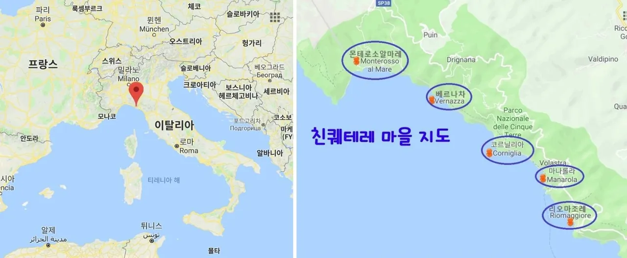 이탈리아 지도에서 몬테로소 알 마레 마을의 위치. 친퀘테레는 몬테로소알마레(Monterosso al Mare), 베르나차(Vernazza), 코르닐리아(Corniglia), 마나롤라(Manarola), 리오마조레(Riomaggiore) 등 5 개의 마을로 이루어졌으며, 몬테로소에서 마지막 마을인 리오마조레까지의 길이는 12km 정도이다.