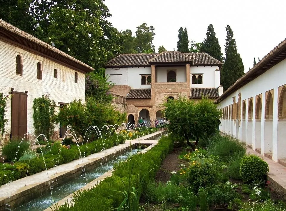 헤네랄리페 Genefalife, 입구부터 사이프러스 나무에 둘러싸인 통로가 길게 뻗어있으며 크고 작은 분수와 흐르는 물이 동화 속에 들어온 듯한 느낌을 주는 이 정원은 알함브라궁전의 여러 정원 중에 현재 남아있는 유일한 정원이라 하며 시에라네바다 산맥의 눈녹은 물을 끌어들여 사계절 꽃을 볼 수 있는 아름다운 정원이다.