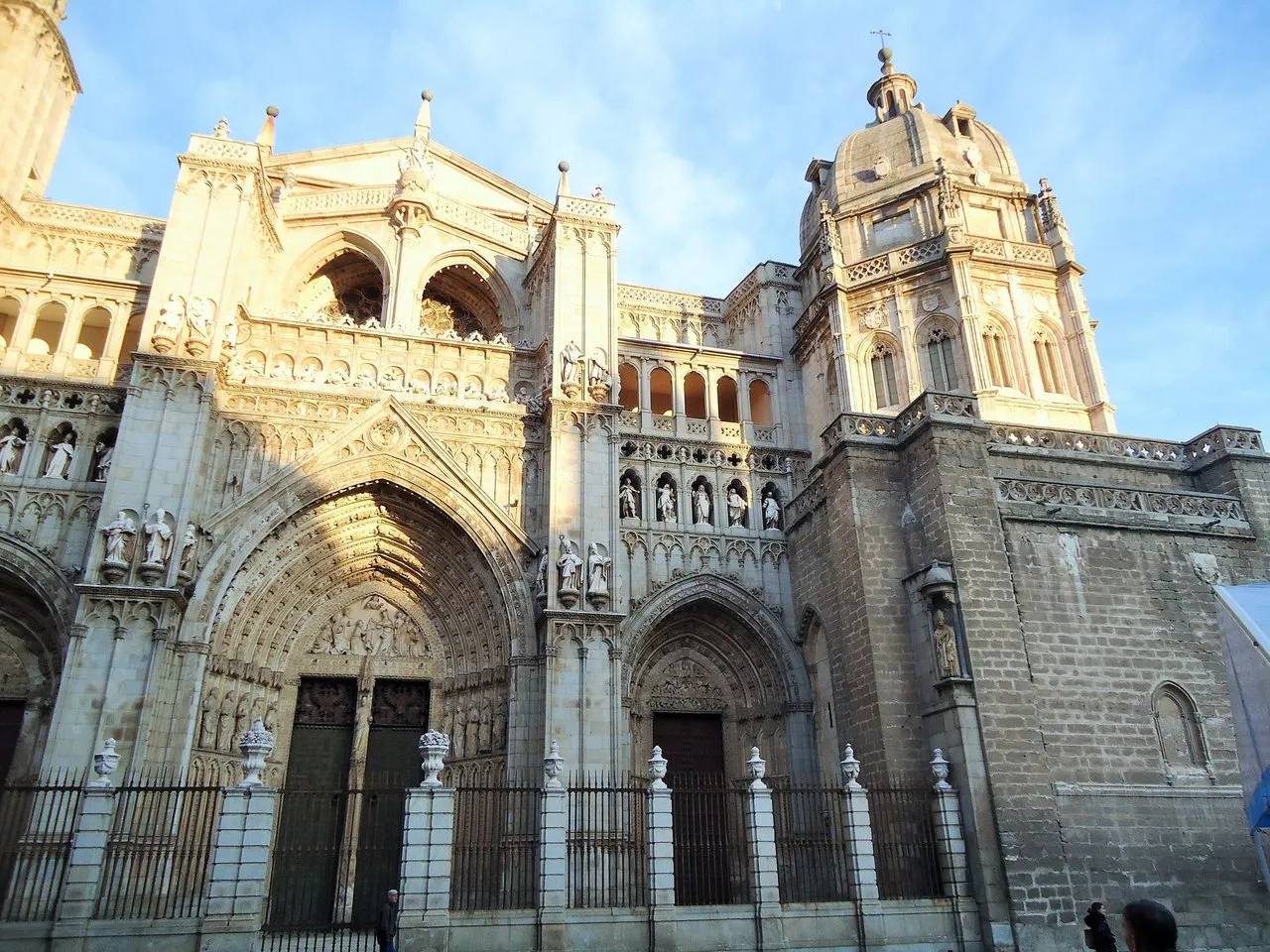 톨레도 대성당 외관. 가운데가 똘레도대성당의 정문이며 중앙의 문은 용서의 문, 왼쪽은 참회의 문, 오른쪽은 지옥의 문으로 불린다.