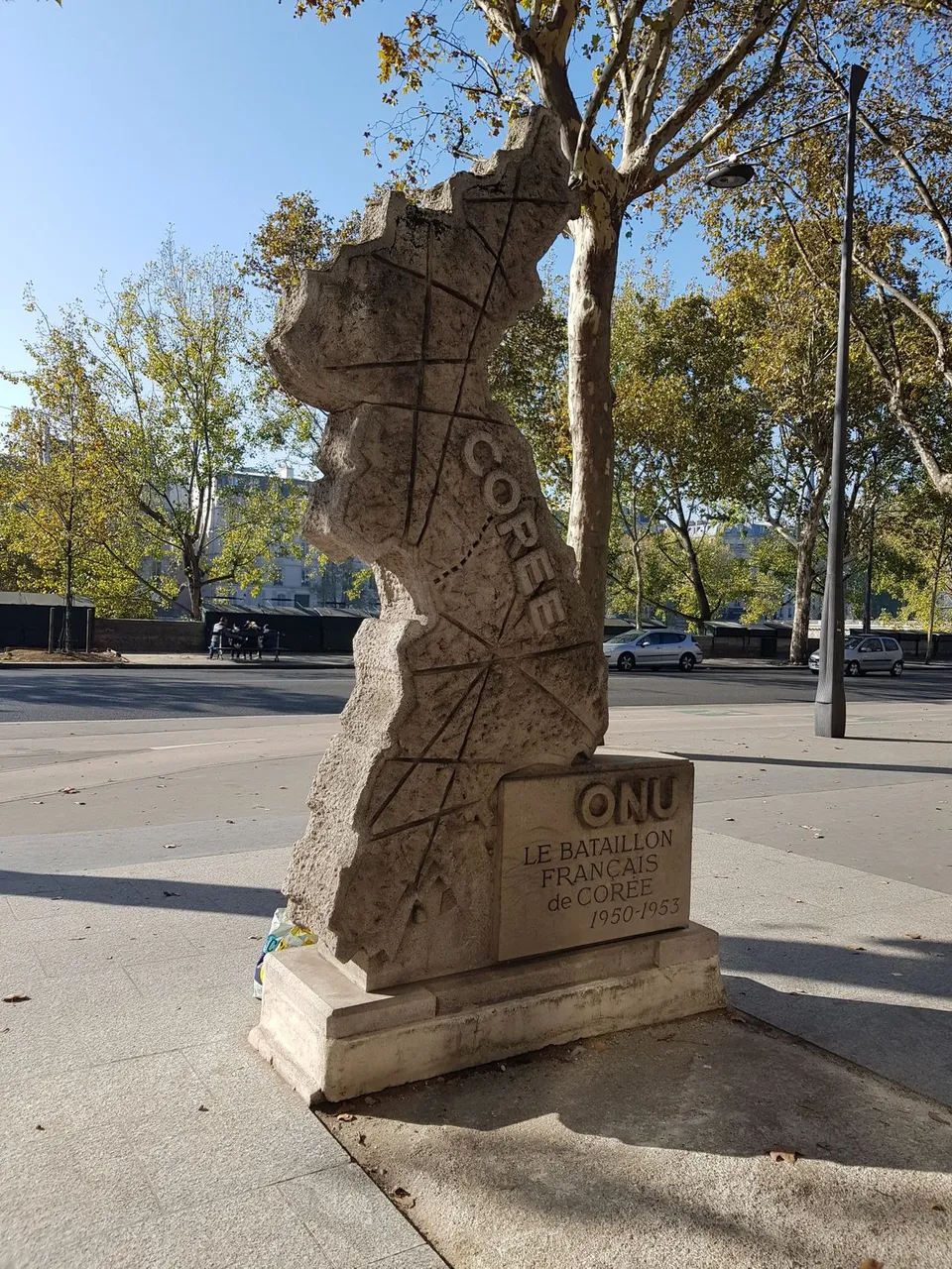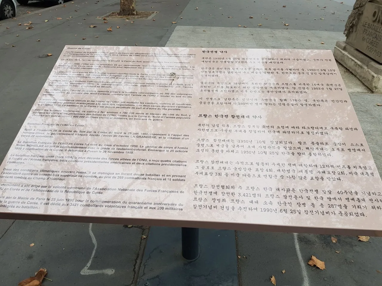 한글과 프랑스어로 1950년 유엔(UN)에서 한국전에 프랑스 군을 파견한 역사를 잘 보여주고 있습니다.