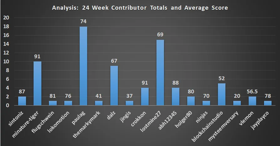 Both 'miniature-tiger' and 'crokkon' lead the way as far as overall average contribution score - both with an exceptional average score of 91 per submission. Six contributors hold average contribution scores above 80 over the past 4 months of data analysis.