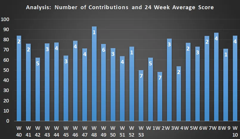 An average score of 85 this week is well over the 24 week average of 72.4. Four contributions this week is a little over the average of 3.5 submissions over the past 22 weeks. Over the past two months, half of the weeks have produced an average contribution score above 80, a great result.