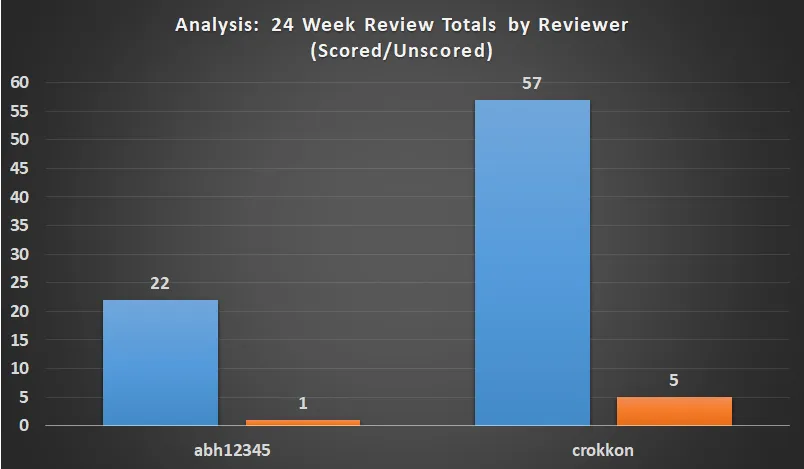 Two reviewers assessed all 79 contributions that received a score in the past 24 weeks. 'crokkon' has reviewed over 72% of all contributions to the category. Six contributions have not been scored during this period.
