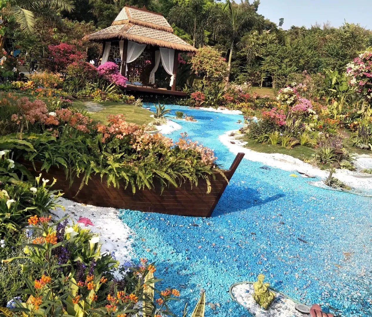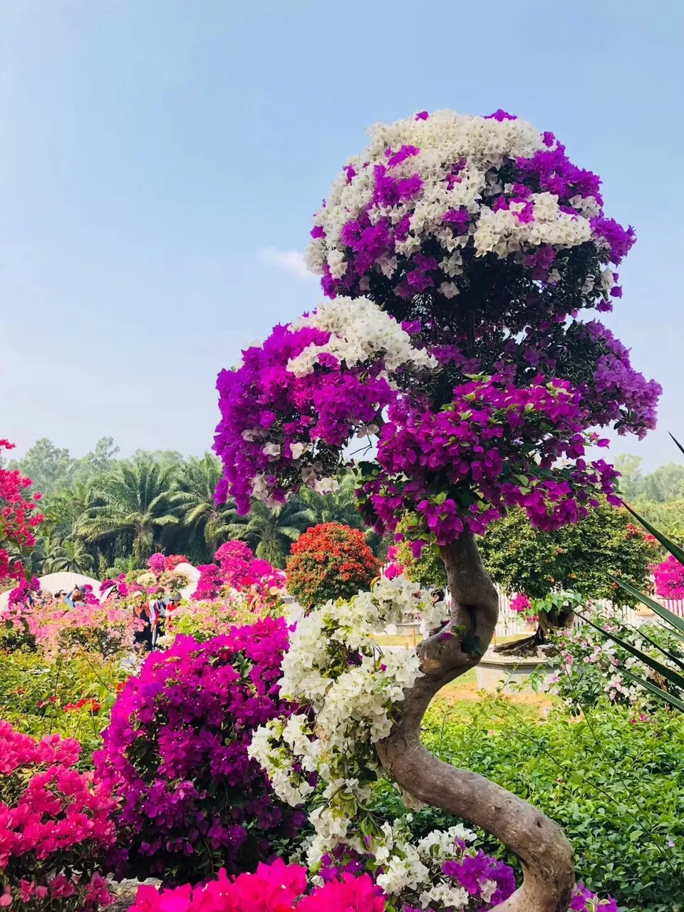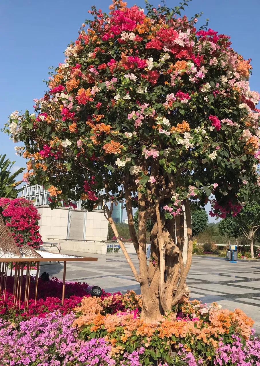 图二是一棵树上开满了五颜六色的簕杜鹃花🌸